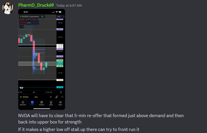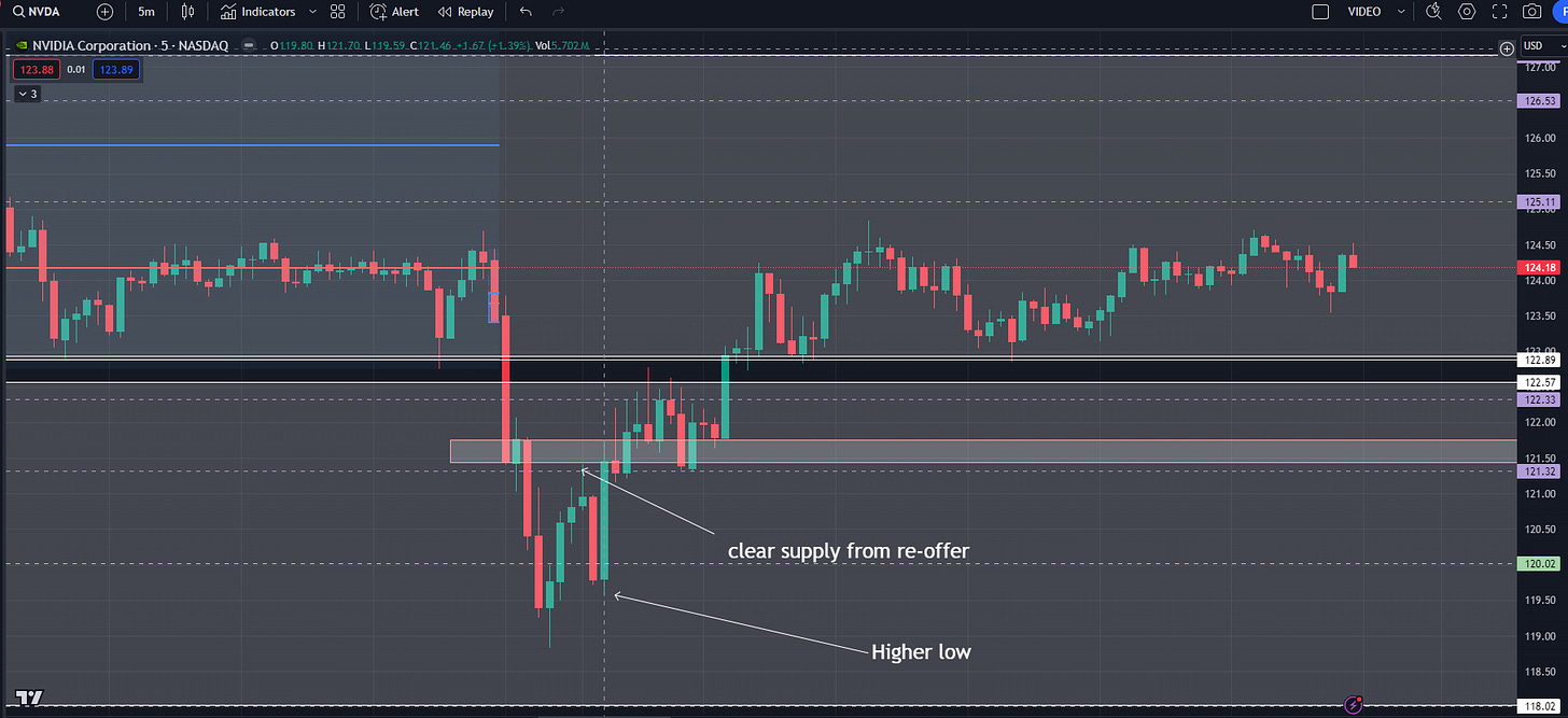 The levels and plan from the NVDA 0.00%↑ and PLTR 0.00%↑ post last night are still valid for use tomorrow. NVDA saw that nasty sell off early so one had to be fast to catch the short. The first potential long didn’t set up but a second chance for an early long presented. Following the clearance of the 5-min re-offer at 121.43 a higher low was put in for a long opportunity.