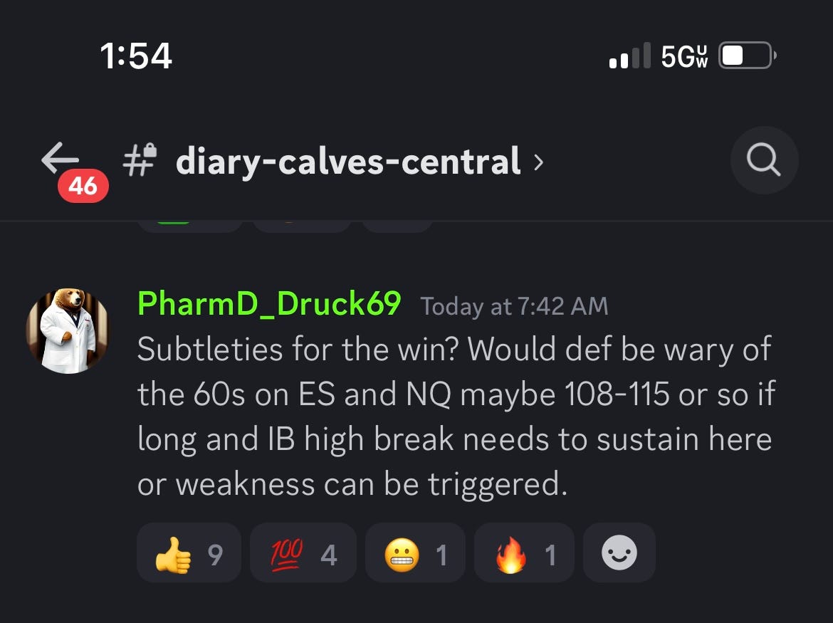 Though most of the day was pretty boring and choppy there was a very nice late day reversion trade to be had. If you’ve read my series below on volume profile the premise of the trade and the target of 5540 should be readily understood. I was looking for a late day liquidation of longs to take price below value for the day, and then to take a long back to the developing VPOC. You can review the premise, execution, and target below for learning purposes. The trade was posted just after low of day 5515 printed.