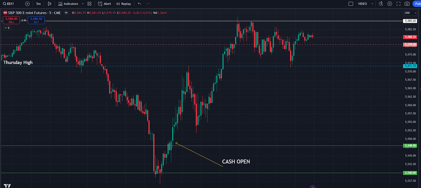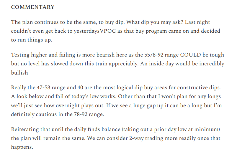 On Friday the plan remained the same. Buy dips. We were cautious as we approached the 78-92 range with our major 5585 level sitting in the middle of it. Overnight traded up to 5583.25 which triggered weakness for the European session. Testing higher first and failing (especially above the prior day high) is always a bit more bearish so our first dip buy area of 5548 (47-53) didn’t hold overnight. Sellers got a bit out of line just before the open, briefly sweeping our next spot, 5540. Both were reclaimed quite quickly and the cash hours low was put in at 5547.5 in the first 5 minutes. After failing at Thursday’s high precisely (this is NOT bearish to me- it is more bearish to look above and fail), the 47-53 range held a higher low (51.75) and the pattern of higher highs and higher lows continued. After reaching the major 5585 spot we saw consolidation between Thursday’s high and 5585. As of now it looks like bullish consolidation just below a major resistance. I would leave Thursday’s high 5571.75 (call it 71) on your chart for this entire week.
