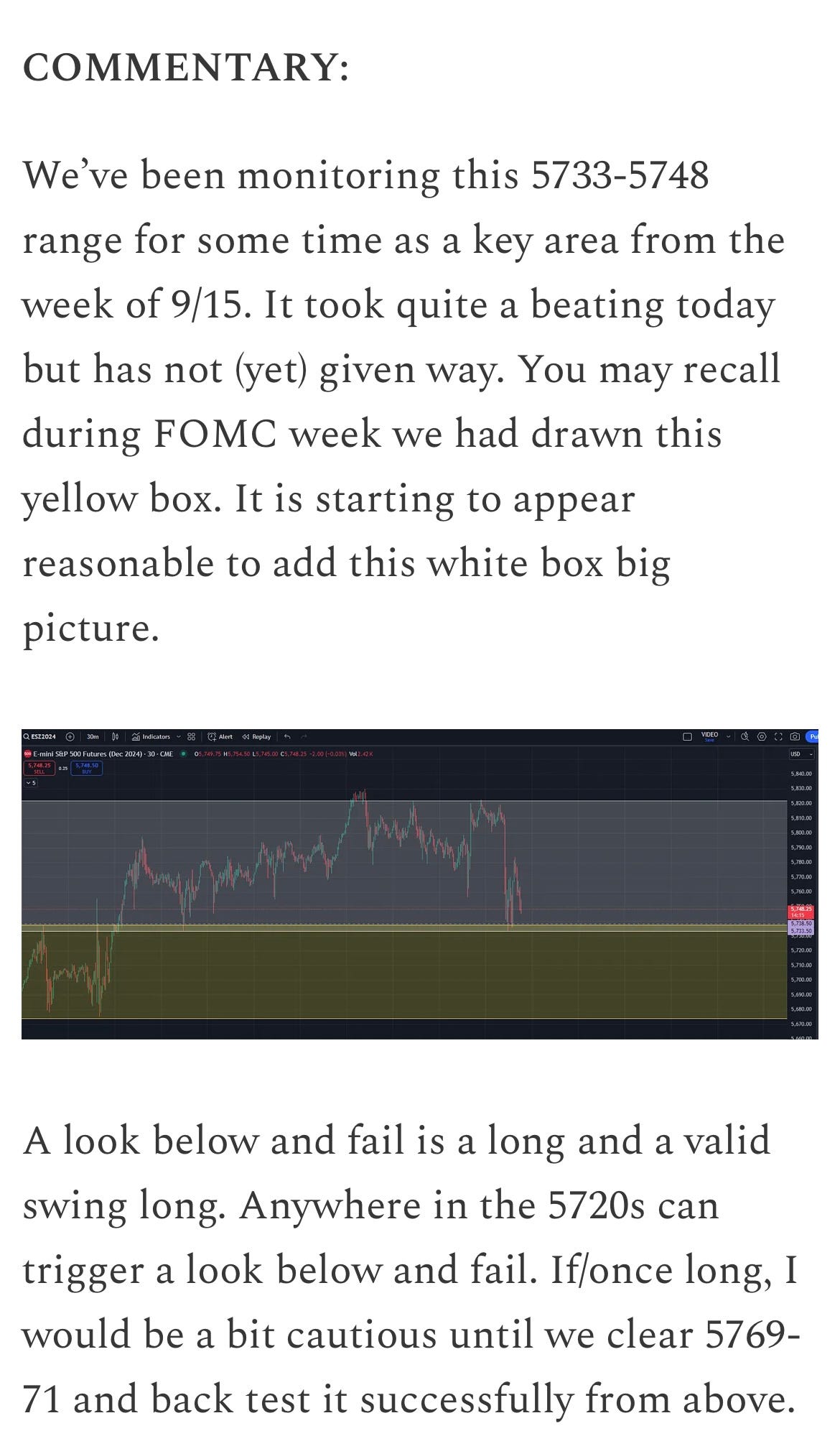 The plan for today on SPY 0.00%↑ was to initiate a swing long attempt on a look below and fail of 5733. We knew that buyers would need to show strength above 5769-5771 for this swing to work. The look below and fail played out, and we rallied to 5769-71. There was quite a bit of passive selling in the 69-71 area (as expected) but bulls defended two back tests of the open afterward. Thus, it was reasonably constructive for bulls but little has changed. For the swing to be good bulls will need to crack both todays high, and really the Tuesday afternoon high to feel comfortable.