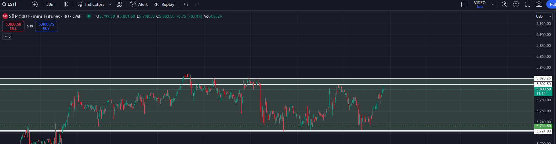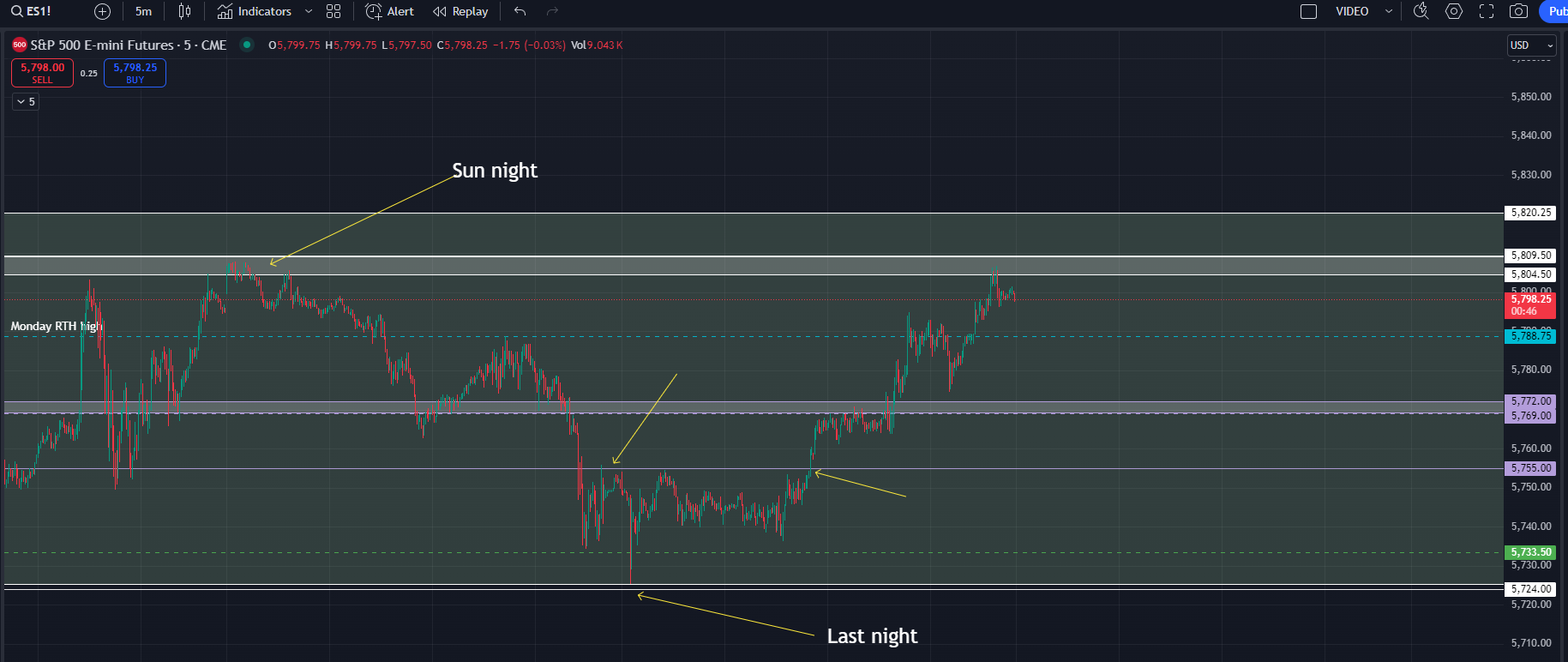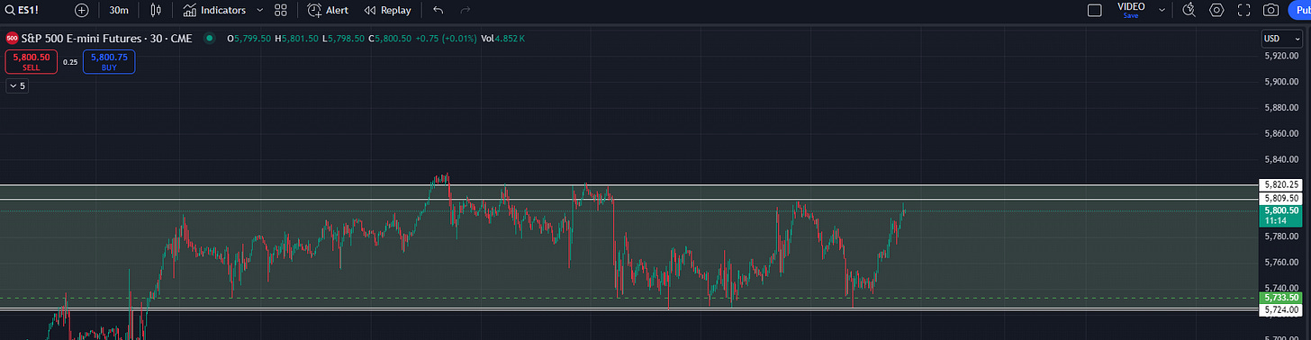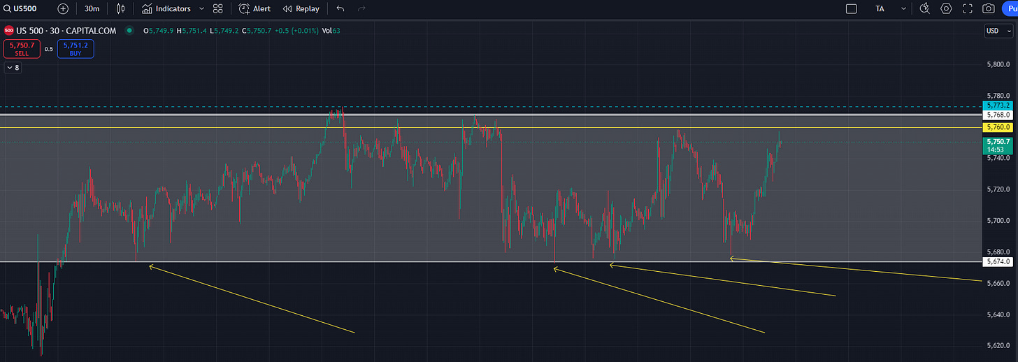 Here’s a look using US500 as it doesn’t decay like ES. I am choosing to use 5768 as the top of the range (though clearly bulls will need to sustain above the current ATH 5773.2). 5760 has also been a rather difficult spot. The bottom of this range I’m using 5674.