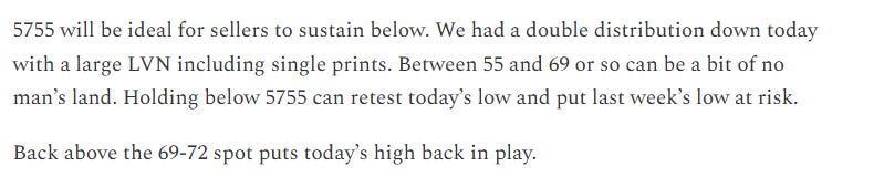 For ES (again, it has decayed since the current ATH) I’m using 5724-5820.25 with 5809.5 (really the entire 5804.75-5809.5 range) as a key spot to clear. Bulls have aggressively bought dips below our 5733.5 level every time.
