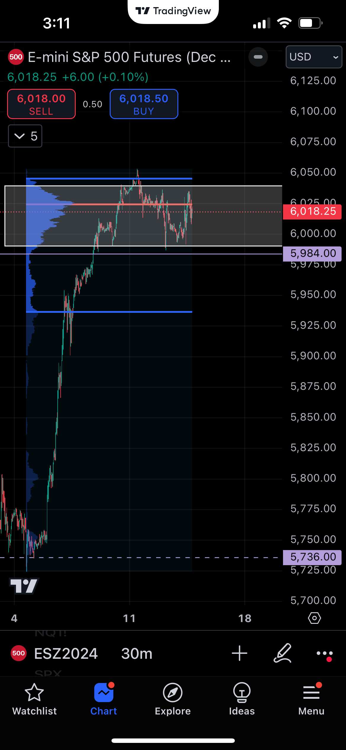 If I were to box this range it would be roughly 5990-6040. We can therefore reasonably execute at the edges or take a look below/above and fail. A breakout/down with continuation is also a valid trade. Because of the preceding bullish trend I am very cautious of a look below and fail if I’m short. That would potentially be a juicy long targeting 6030-6040 (and likely an upside breakout). I would flip directionally long if that plays out. A look above and fail can target the bottom and after yet another fail it has the potential for a downside break.