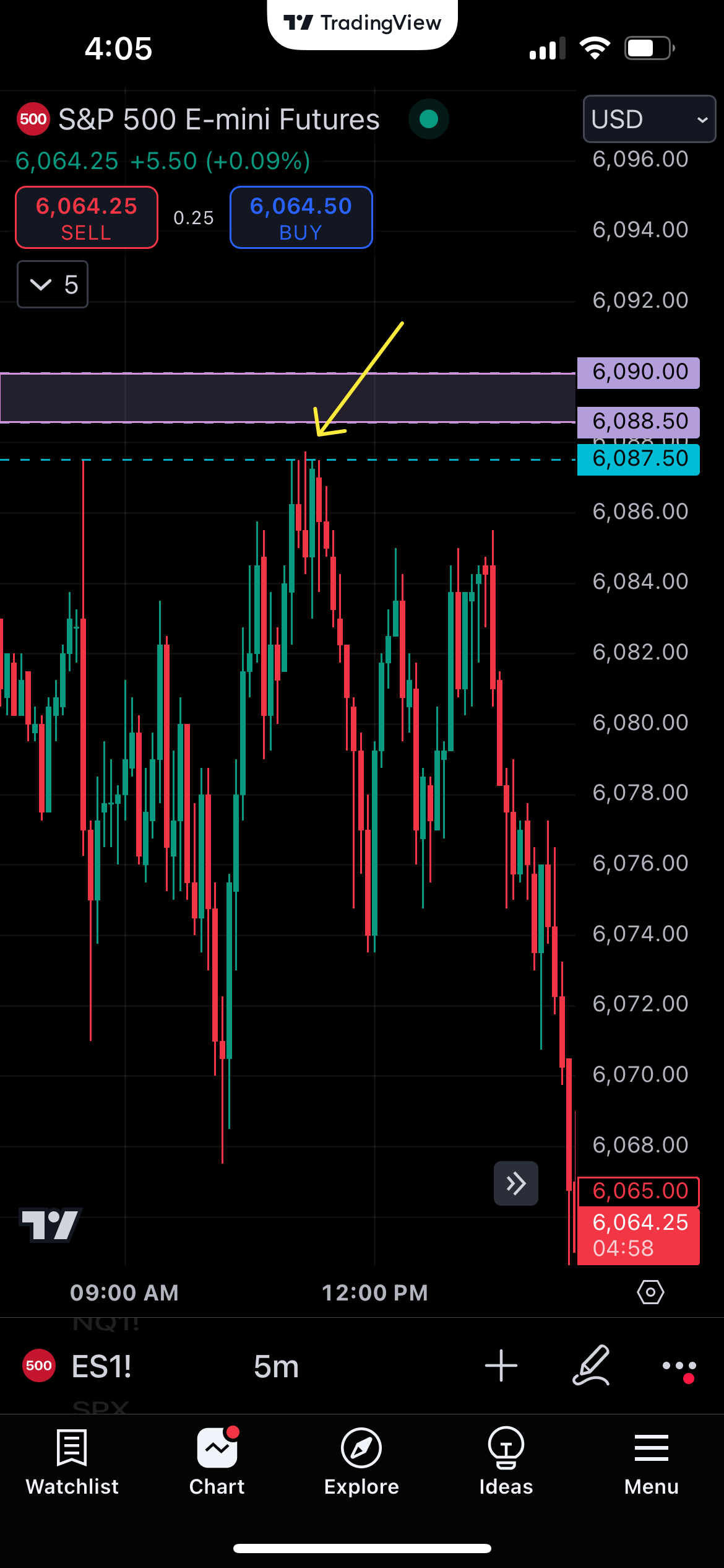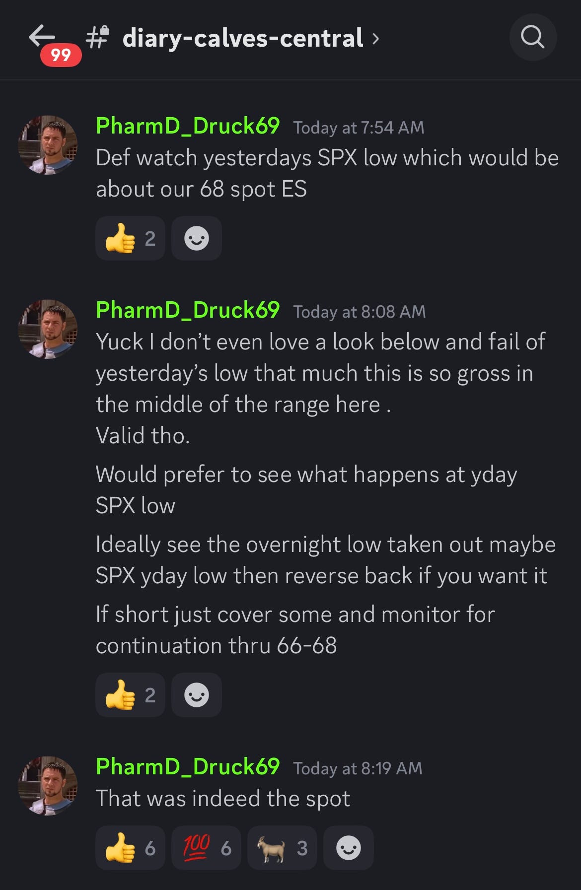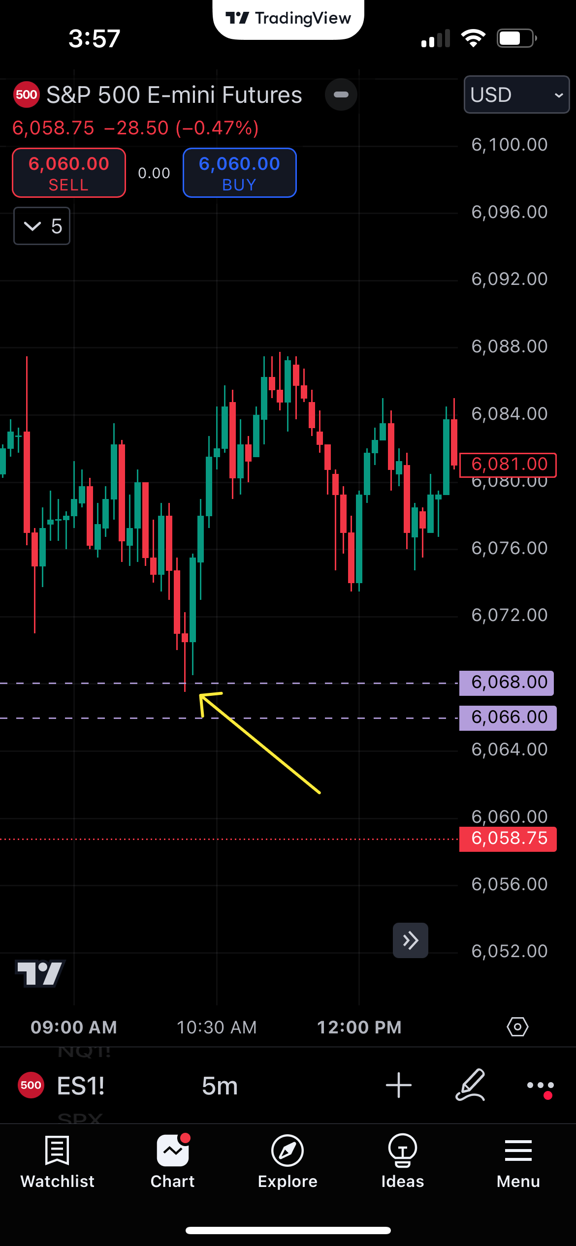 The open was bearish so we were looking to trade lower first and maybe set up a long. The action was quite bad so even though yesterdays ES low was 72.5 I wanted to see a look below and fail of yesterdays SPX low which translated to roughly 6068 on ES. The low was 6067.5 and produced a nice 20 handle long.
