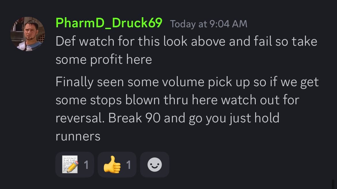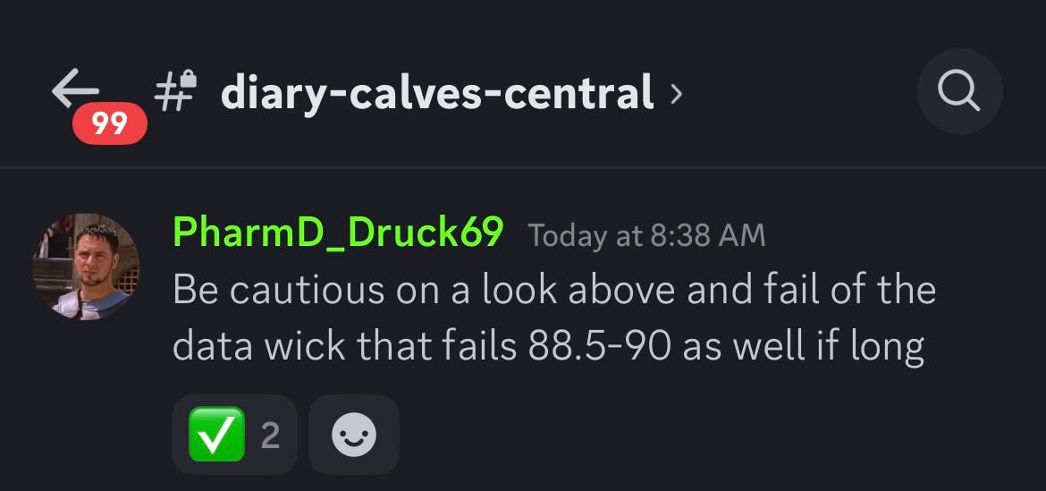 The action remained quite bad but the next decent trade setup was a sweep of the overnight data high that failed our 88.5-90 spot. The wick was taken out by a single tick and there was at least some decent volume into it but it was still a rather lack luster moment. The reversal worked, however, and made for a decent trade.