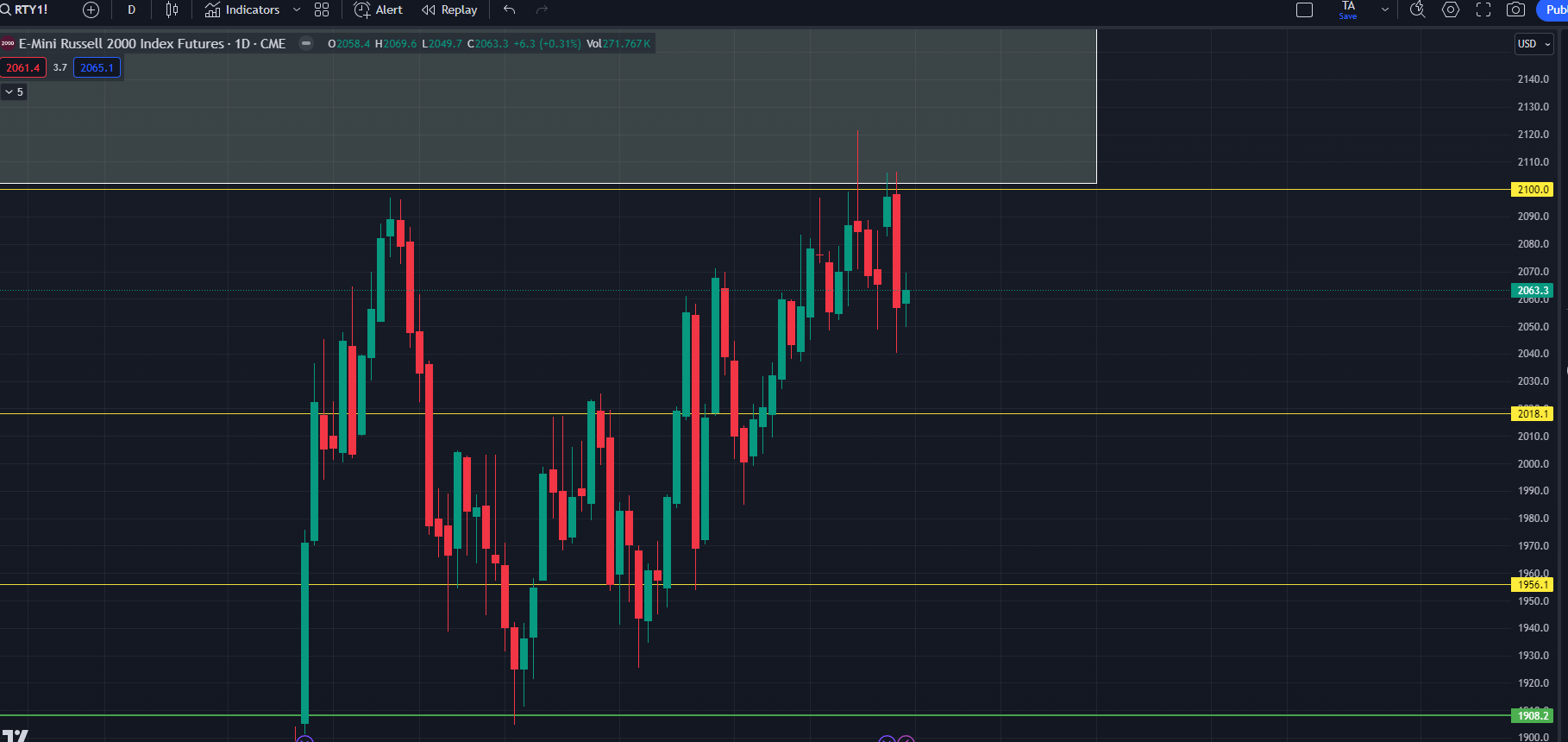 Last weekend I had posted this chart of IWM 0.00%↑ RTY into this 2100 resistance and box back test. Friday’s fail was confirmed this week.