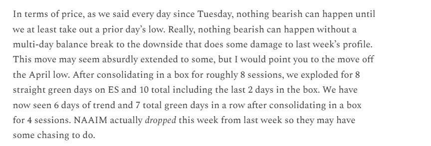 Many of you may be bearish. I get it. However, nothing bearish in price can really happen until we a multi-day balance break to the downside. Thursday’s selloff did nothing but form a multi-day balance. We were fully prepared for this since Tuesday and many of us longed the close on Thursday. We remain in balance now, which I’ll characterize as a 5-day balance. From last week’s plan: