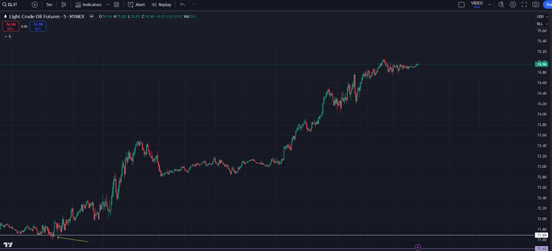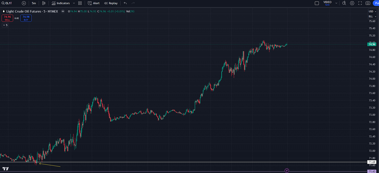 We entered a long on Crude Oil futures Wednesday night/Thursday AM. The entry of 71.69 took 9 ticks of drawdown (71.6 low) before crude traded to 75 today.